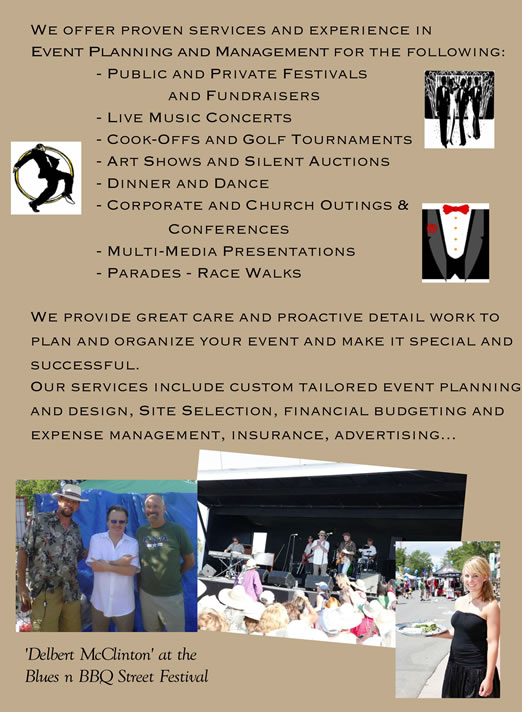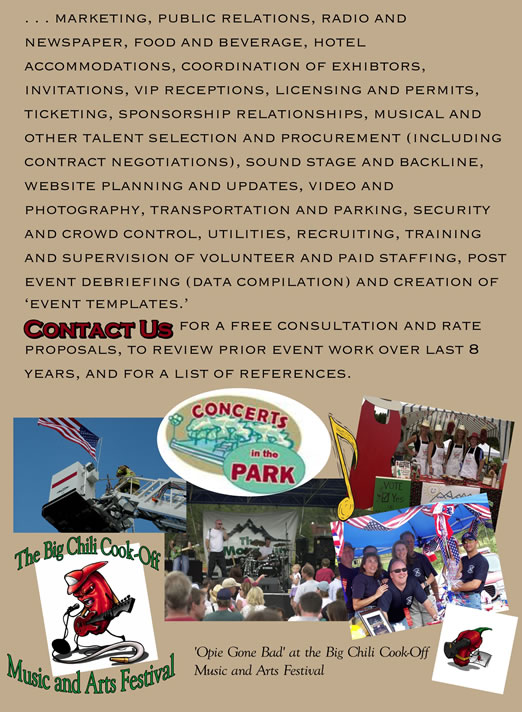 Our services include custom tailored event planning and design, Site Selection, financial budgeting and  expense management, insurance, advertising, marketing, public relations, radio and newspaper, food and beverage, hotel accommodations, coordination of exhibtors, invitations, vip receptions, licensing and permits, ticketing, sponsorship relationships, musical and other talent selection and procurement (including contract negotiations), sound stage and backline, website planning and updates, video and photography, transportation and parking, security and crowd control, utilities, recruiting, training and supervision of volunteer and paid staffing, post event debriefing (data compilation) and